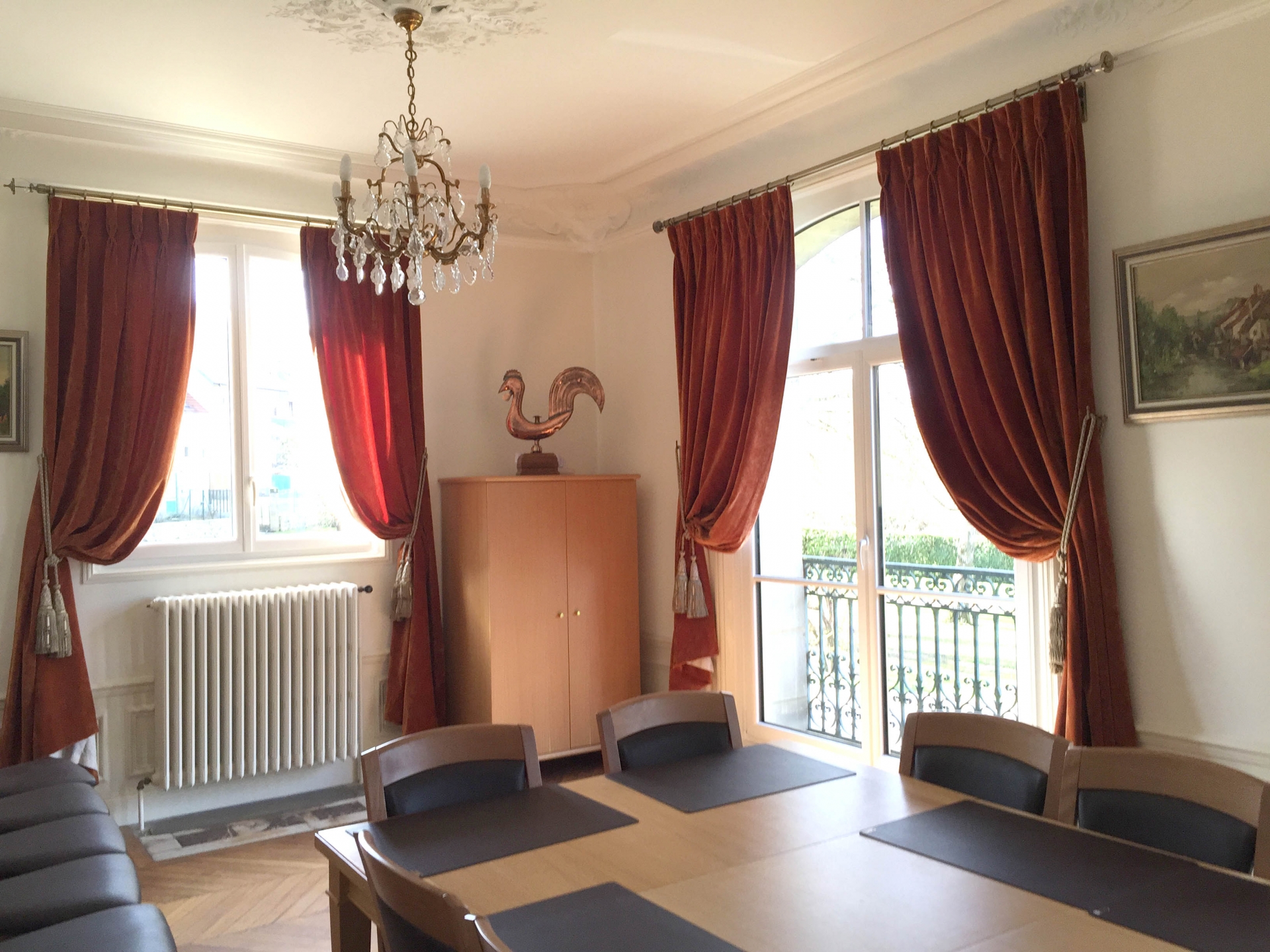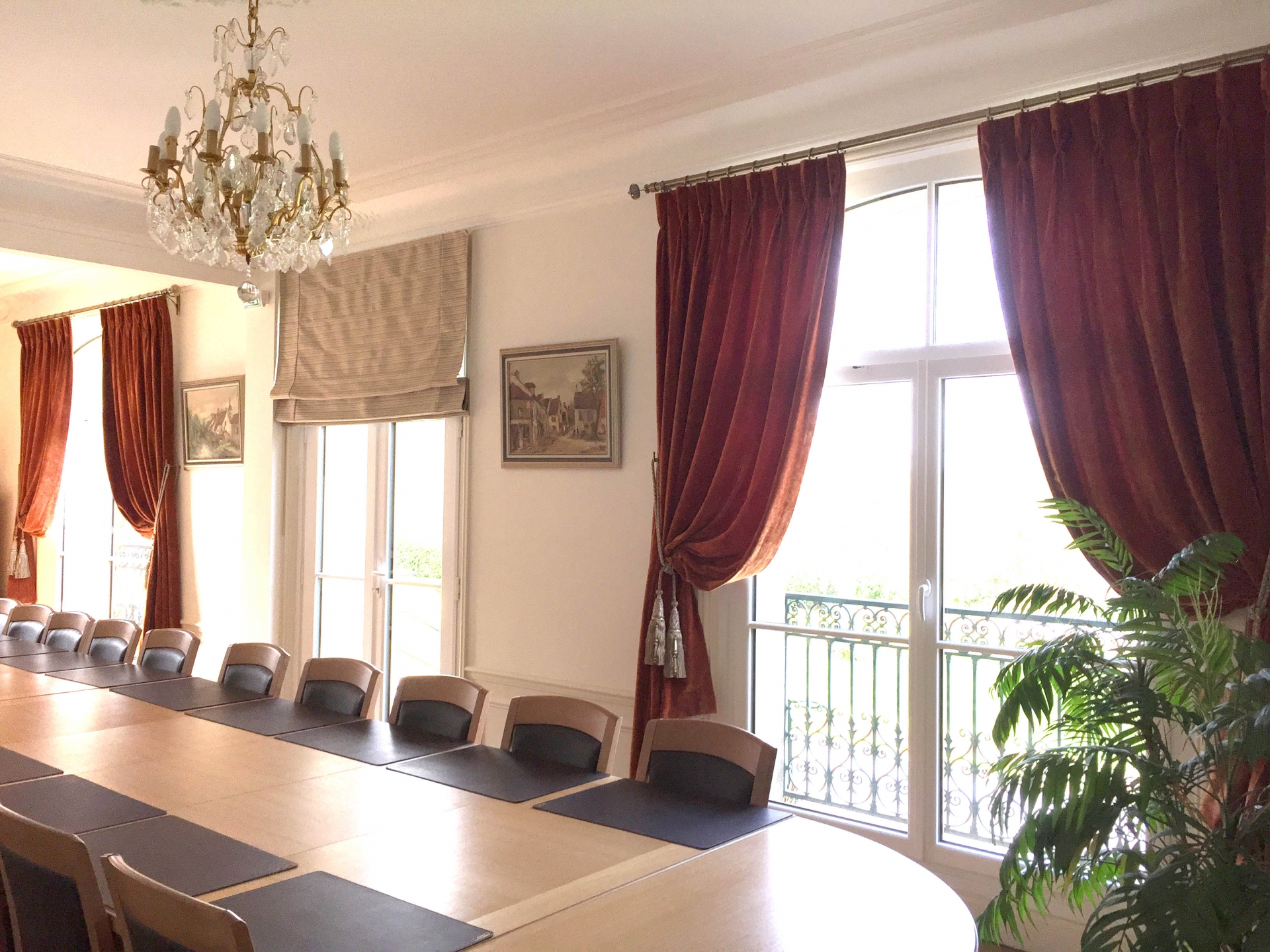 Confection et installation de rideaux en velours doublés et de stores américains en fibres naturelles.