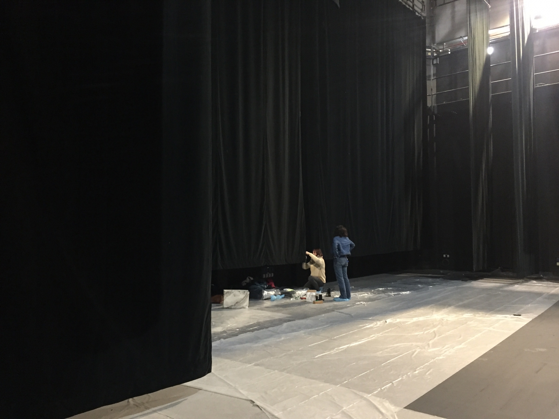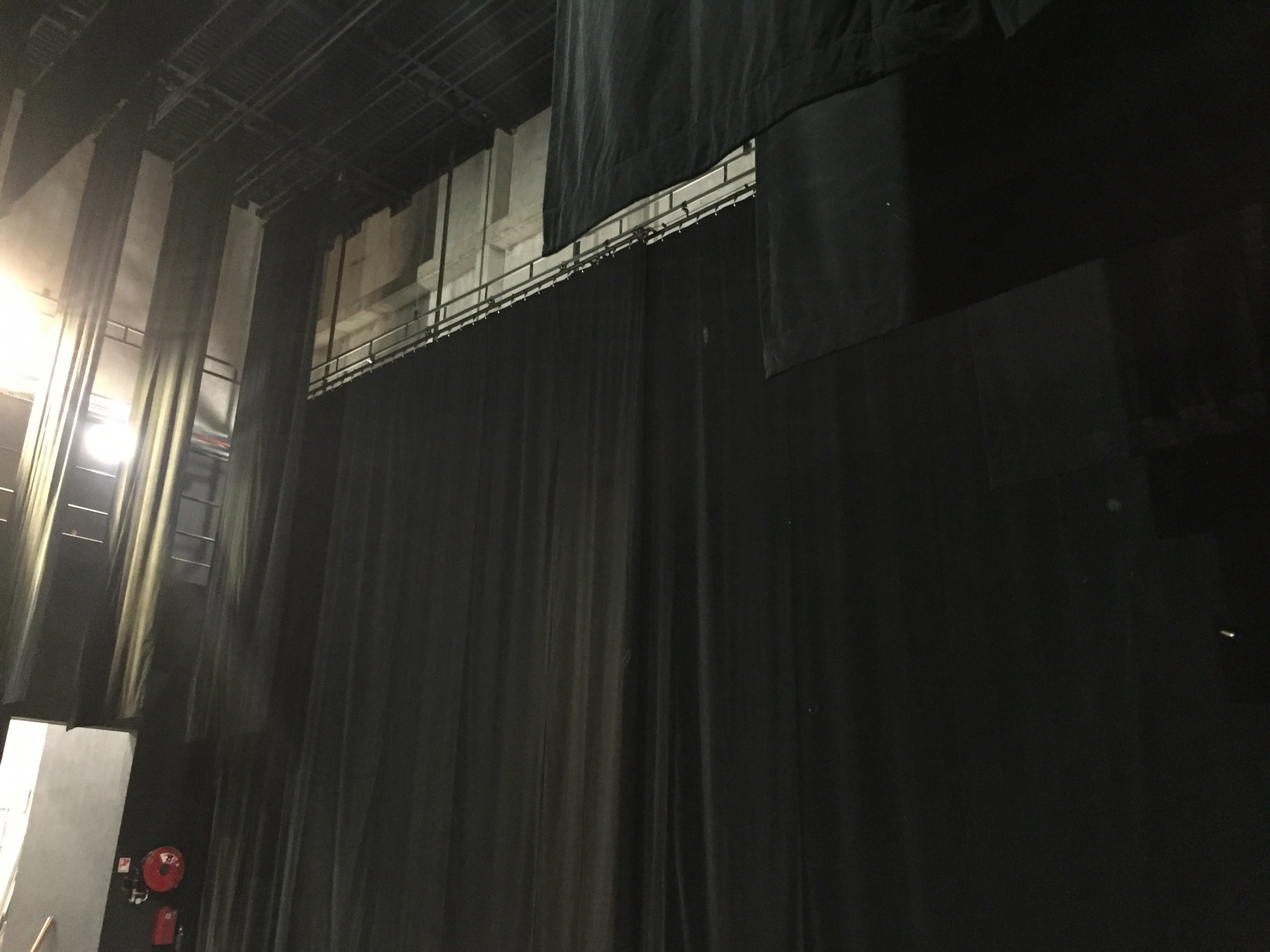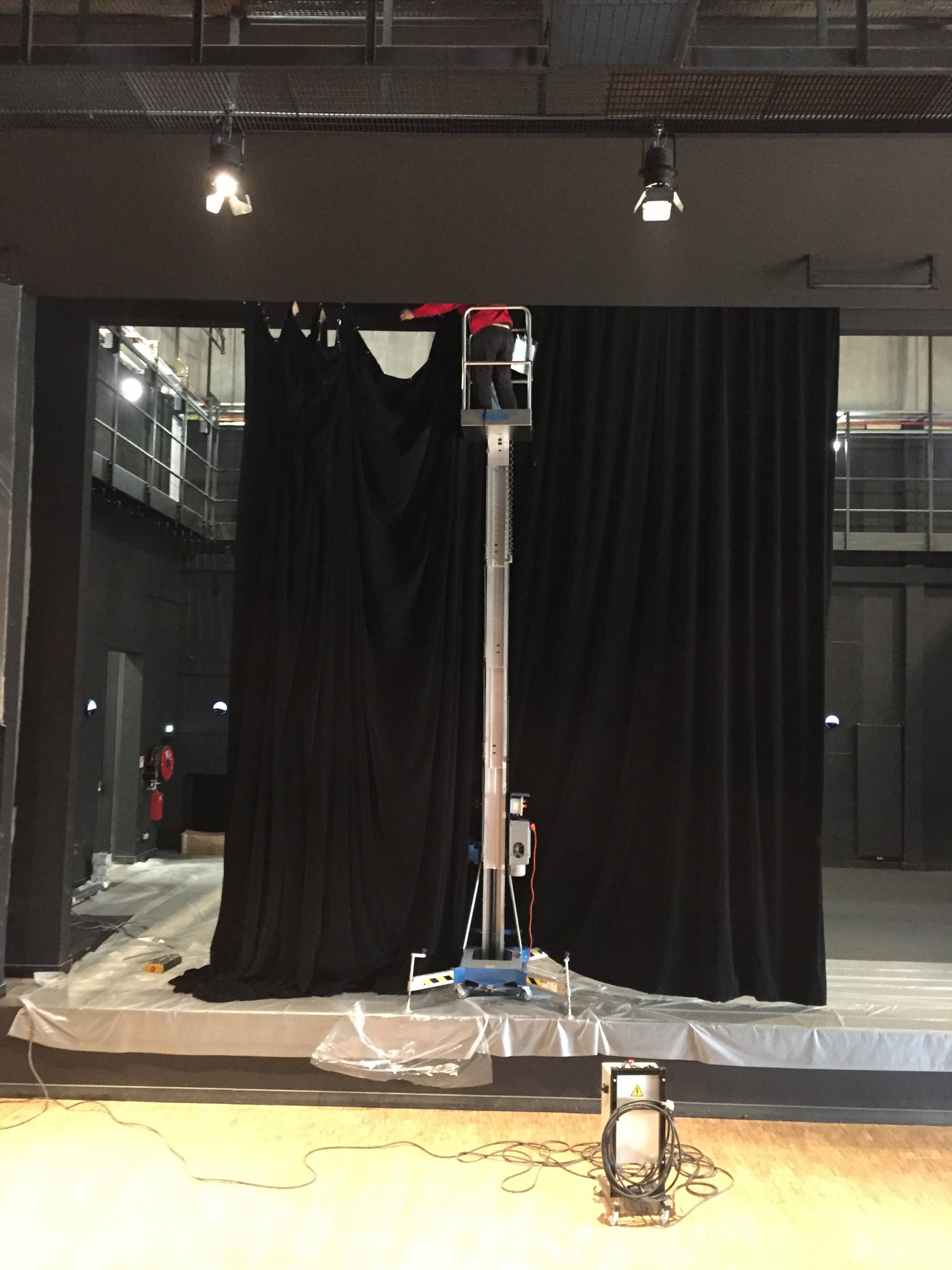 Confection et installation de rideaux de scène, frises, pendrillons et cyclorama pour la salle de spectacle.