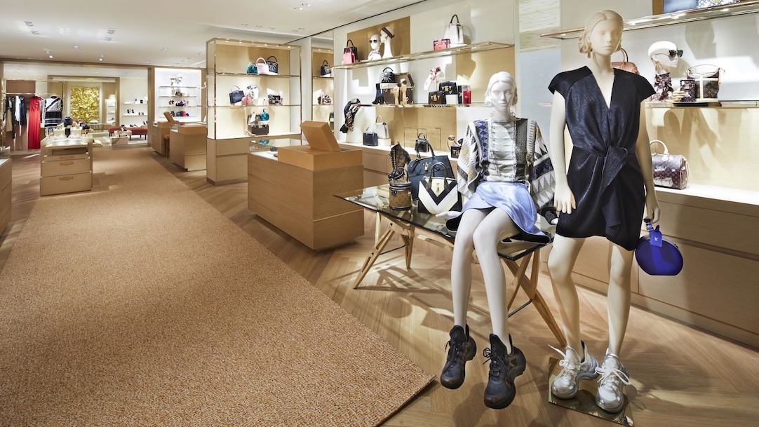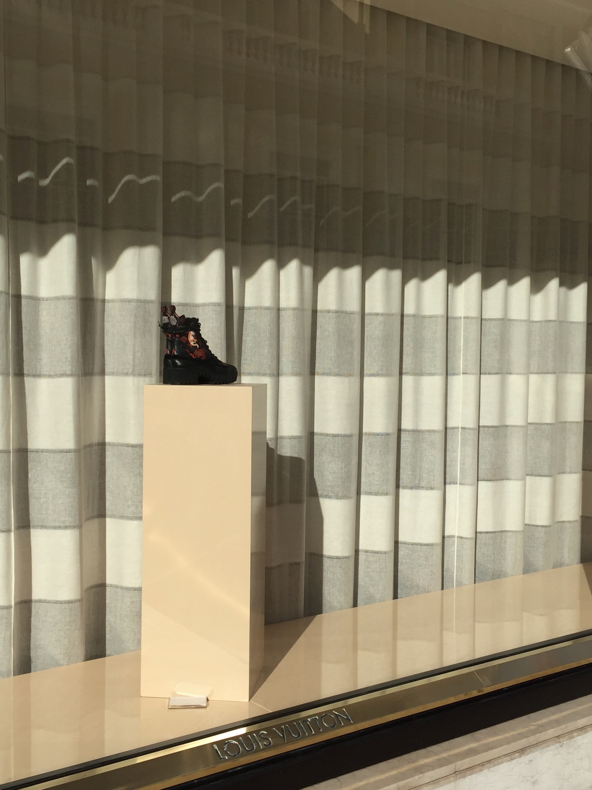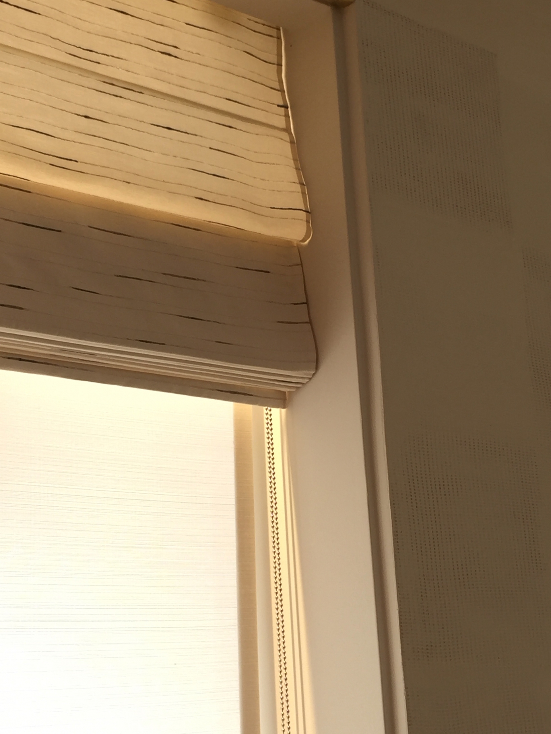 Confection et installation de stores américains devant panneau de voile tendu sur cadre bois au R+1 et voilage Wave pour la vitrine au RDC.