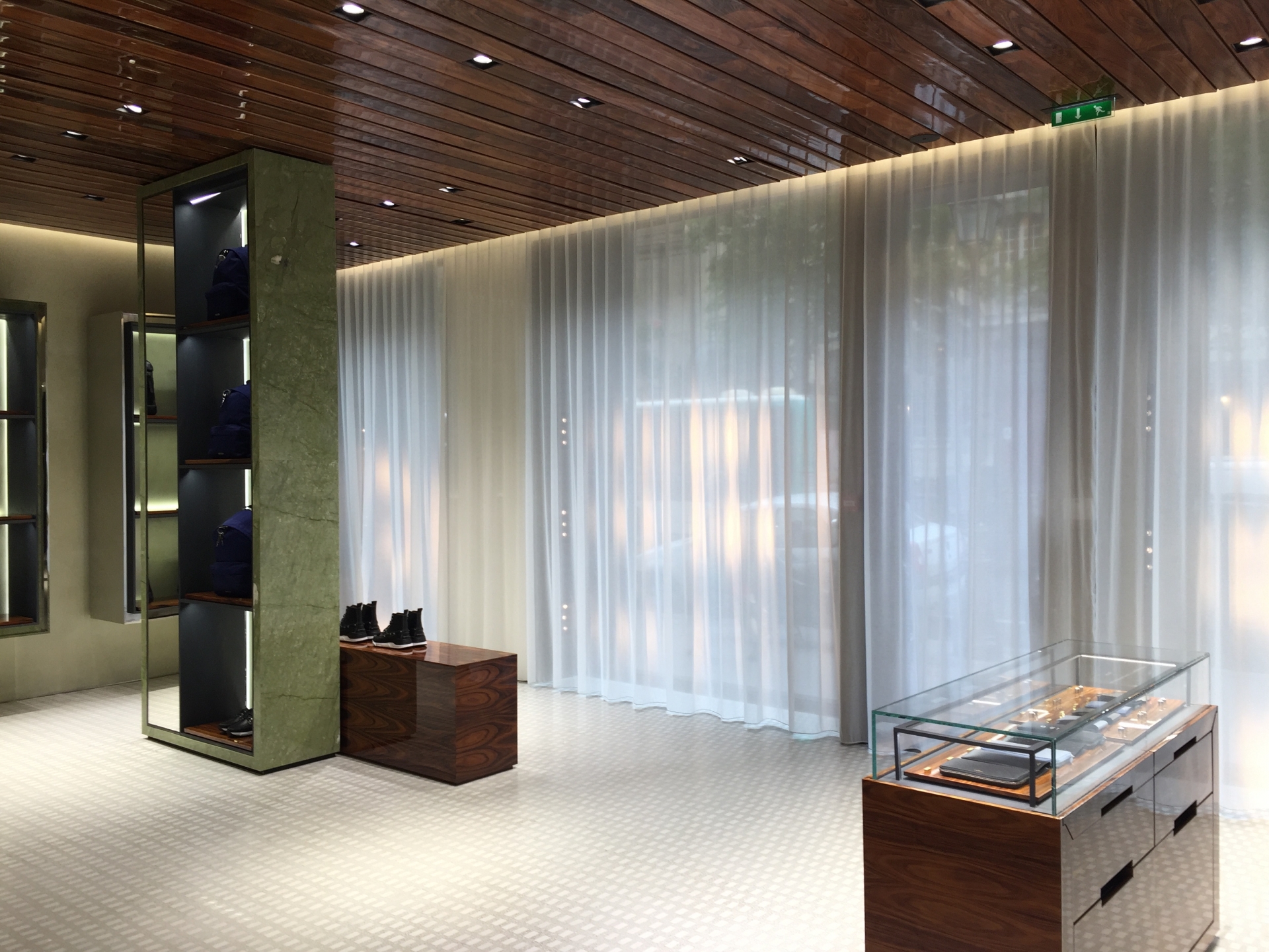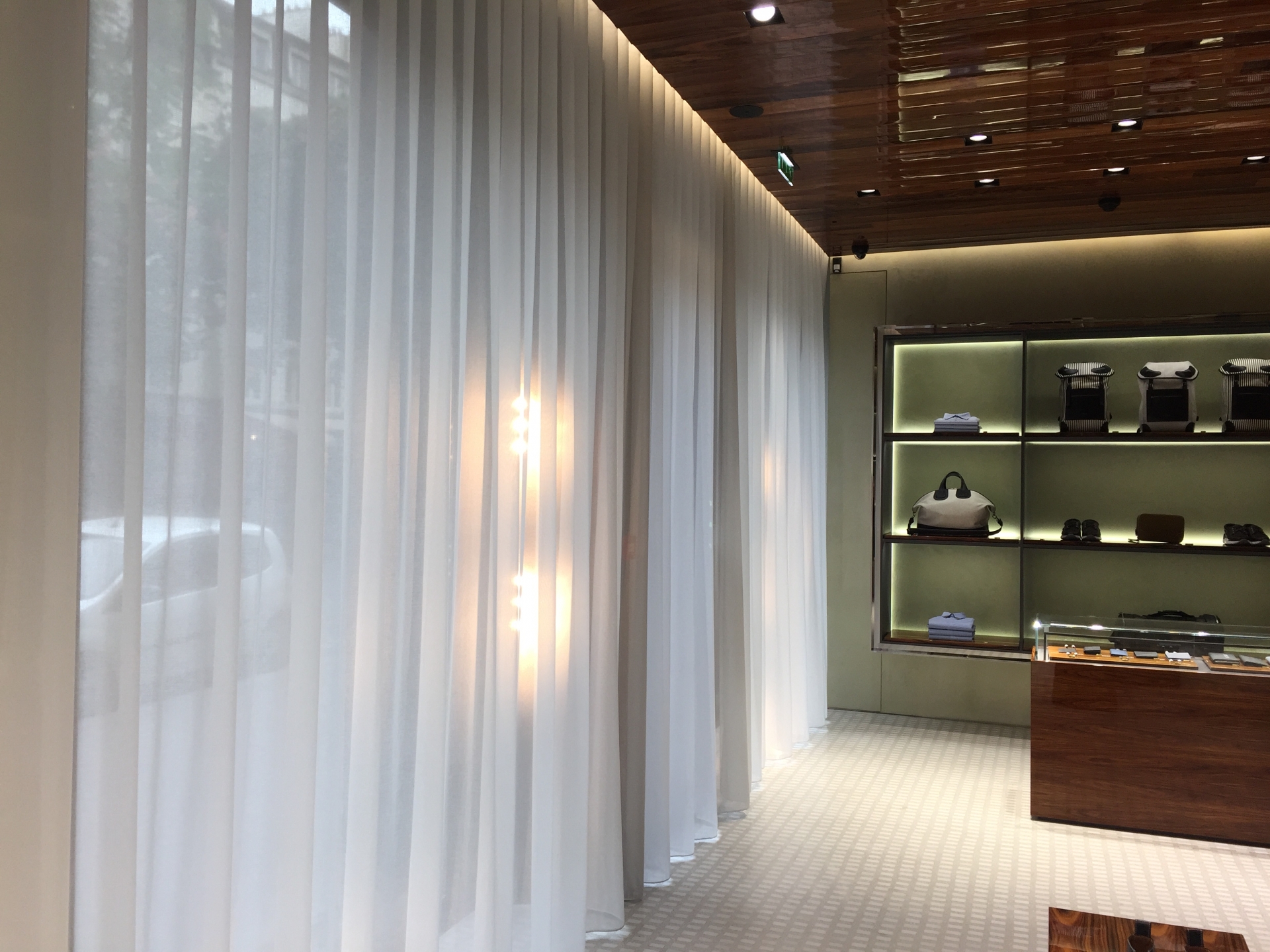 Confection et installation de voilage Wave sur tringle électrique de 12 mètres avec retour pour replis complet derrière cloison.