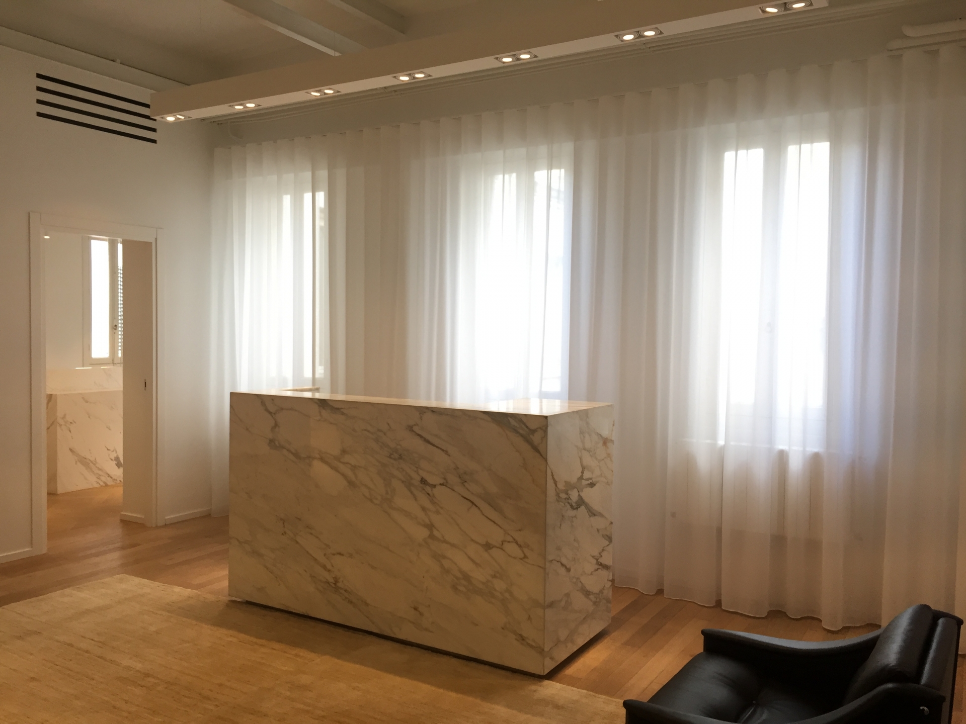 Confection et installation de voilage Wave pour l’accueil Avenue Montaigne.