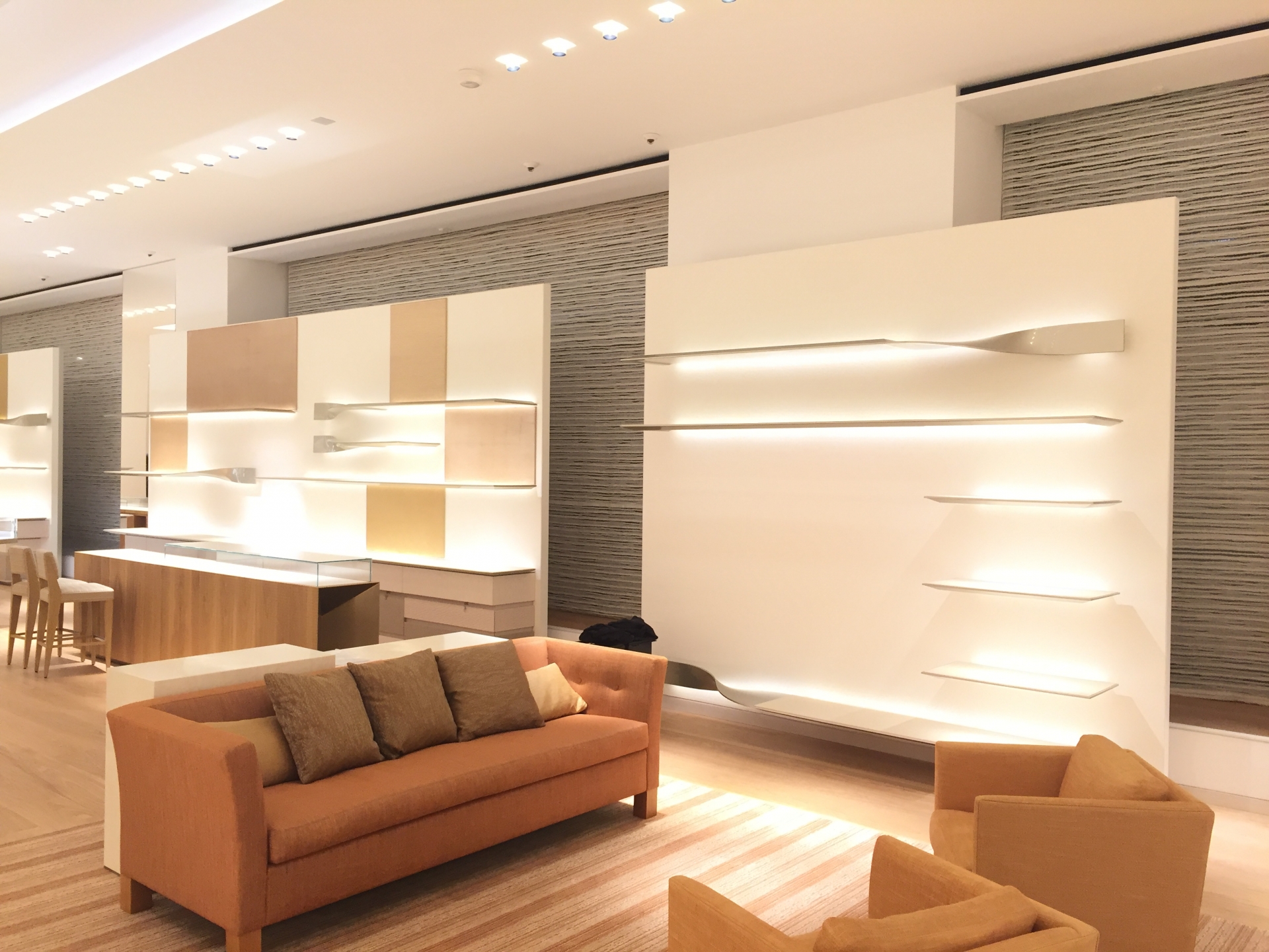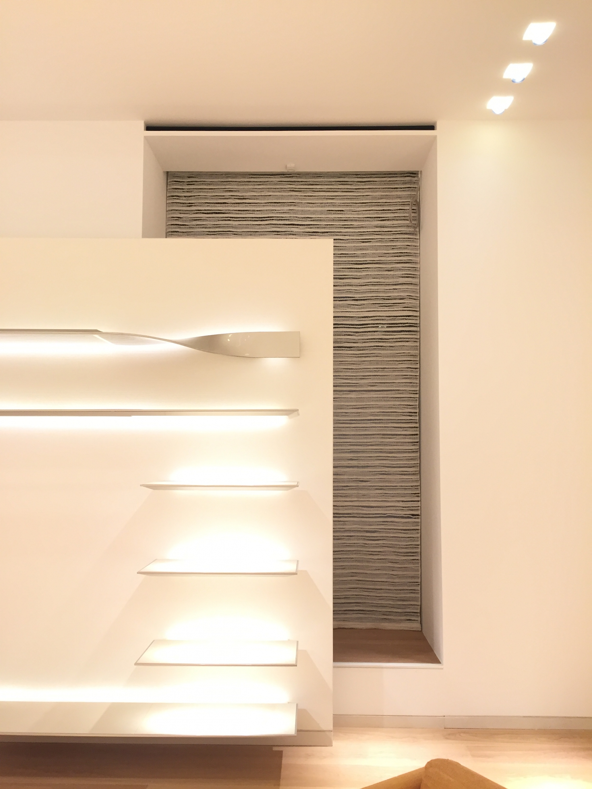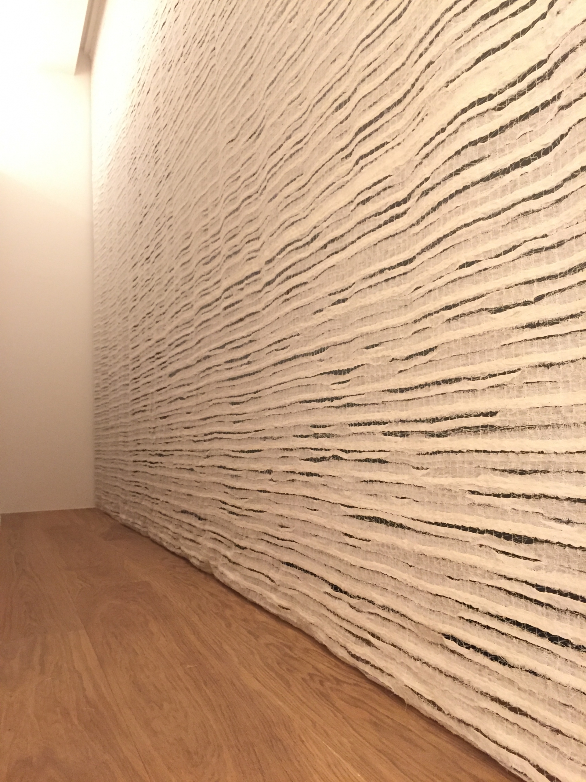 Confection et installation de rideaux tendus réalisés dans un tissu composé de fines bandes de voile de lin rassemblées.