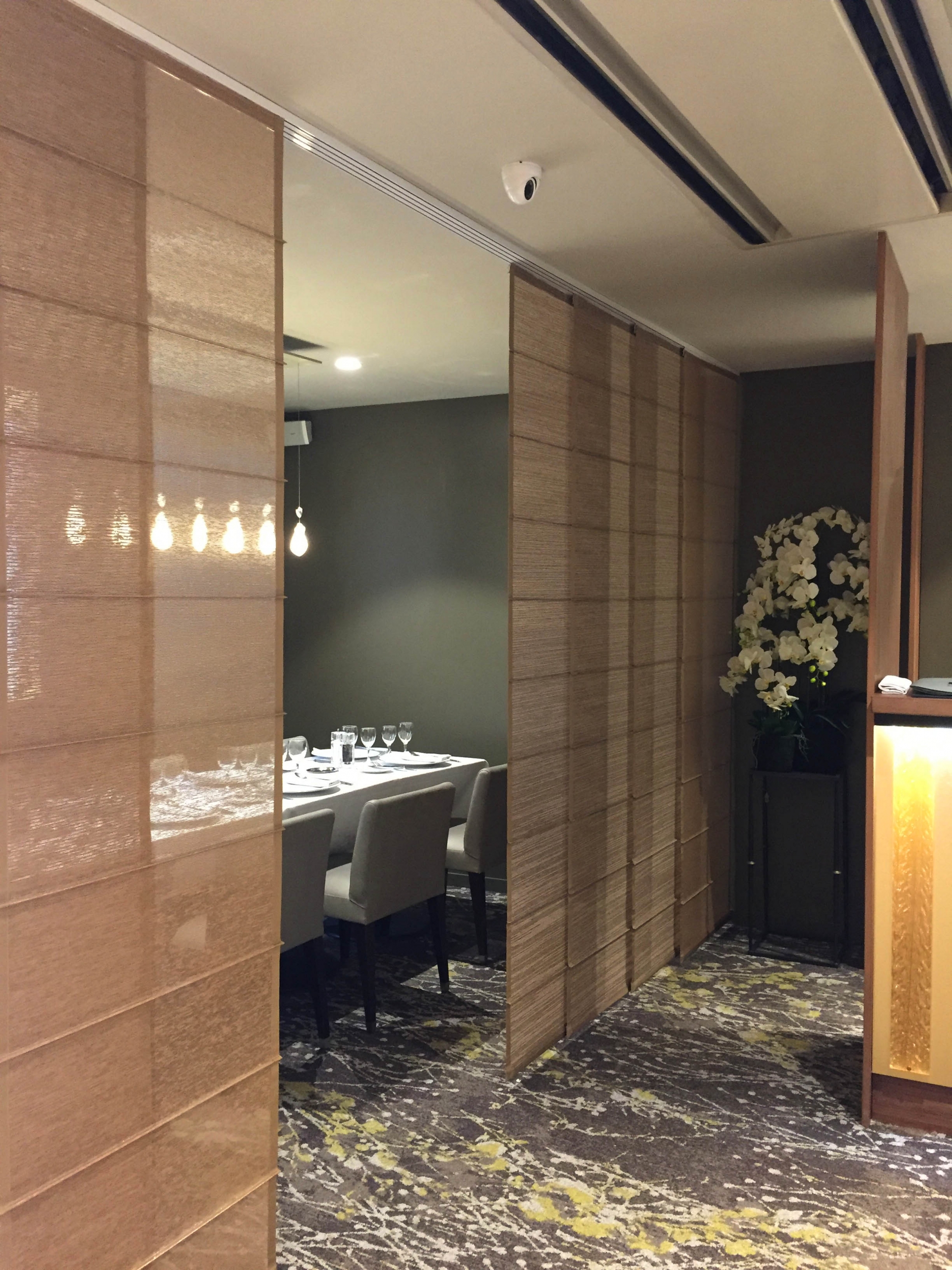 Confection et installation de parois japonaises en fibres naturelles et de panneaux en tissu tendu pour le restaurant de l’Institut Vatel dont la cuisine raffinée des chefs et étudiants à fait la réputation de l’école à travers le monde. Mais aussi de stores vénitiens bois et de parois japonaises pour les salles des séminaires.