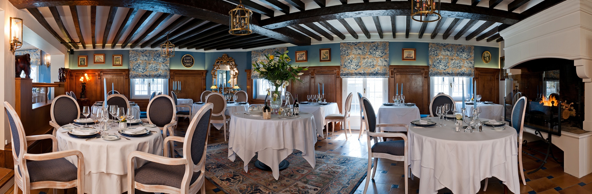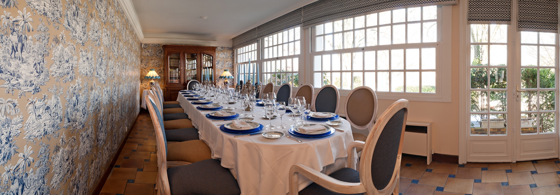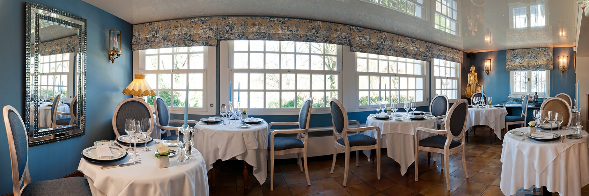 Confection et installation de stores américains et pose de tenture murale pour ce restaurant au charme discret et raffiné situé en bord de Marne, au cœur du village de Germigny l’Evêque.