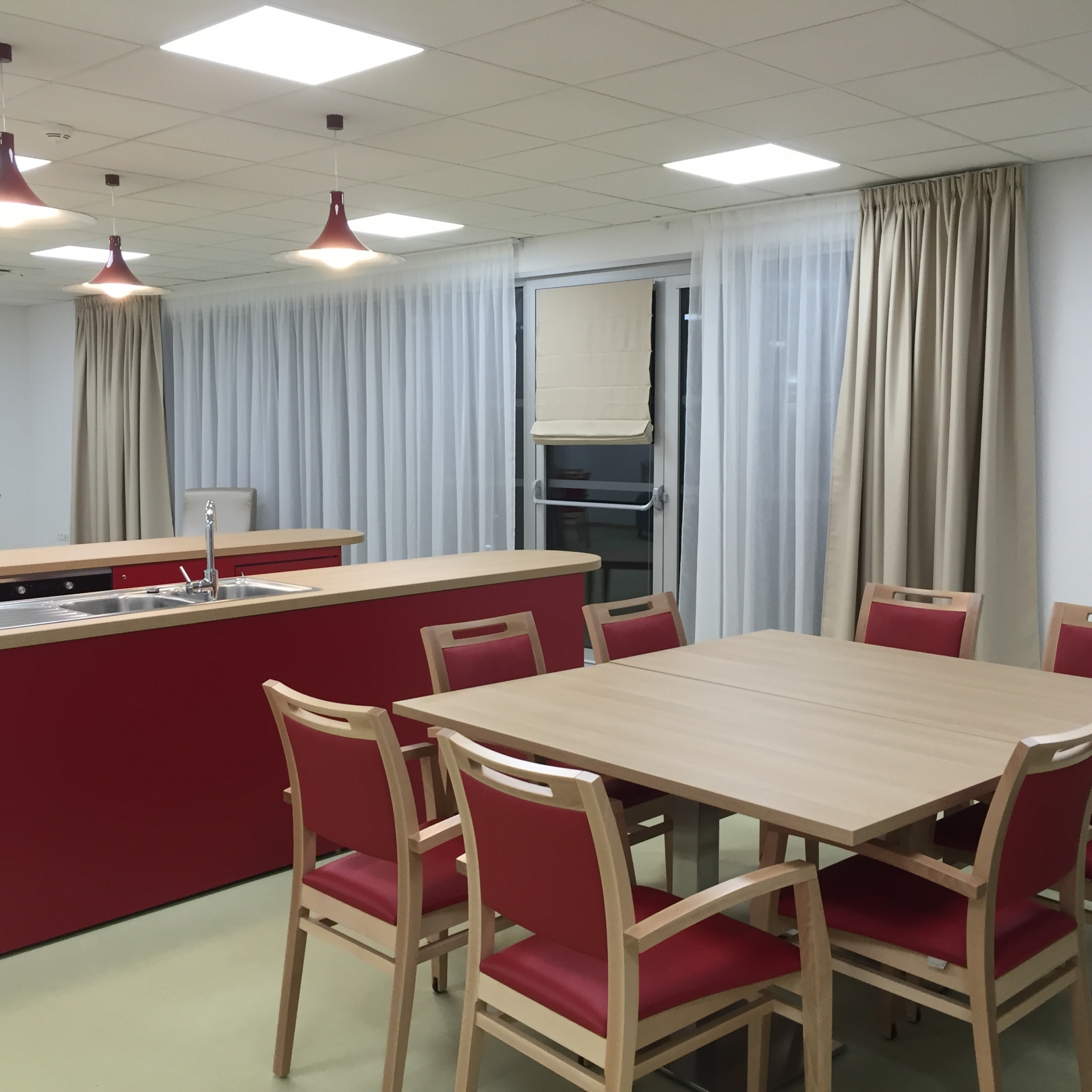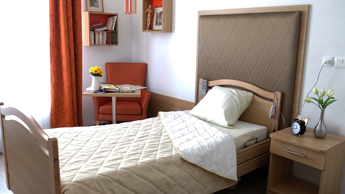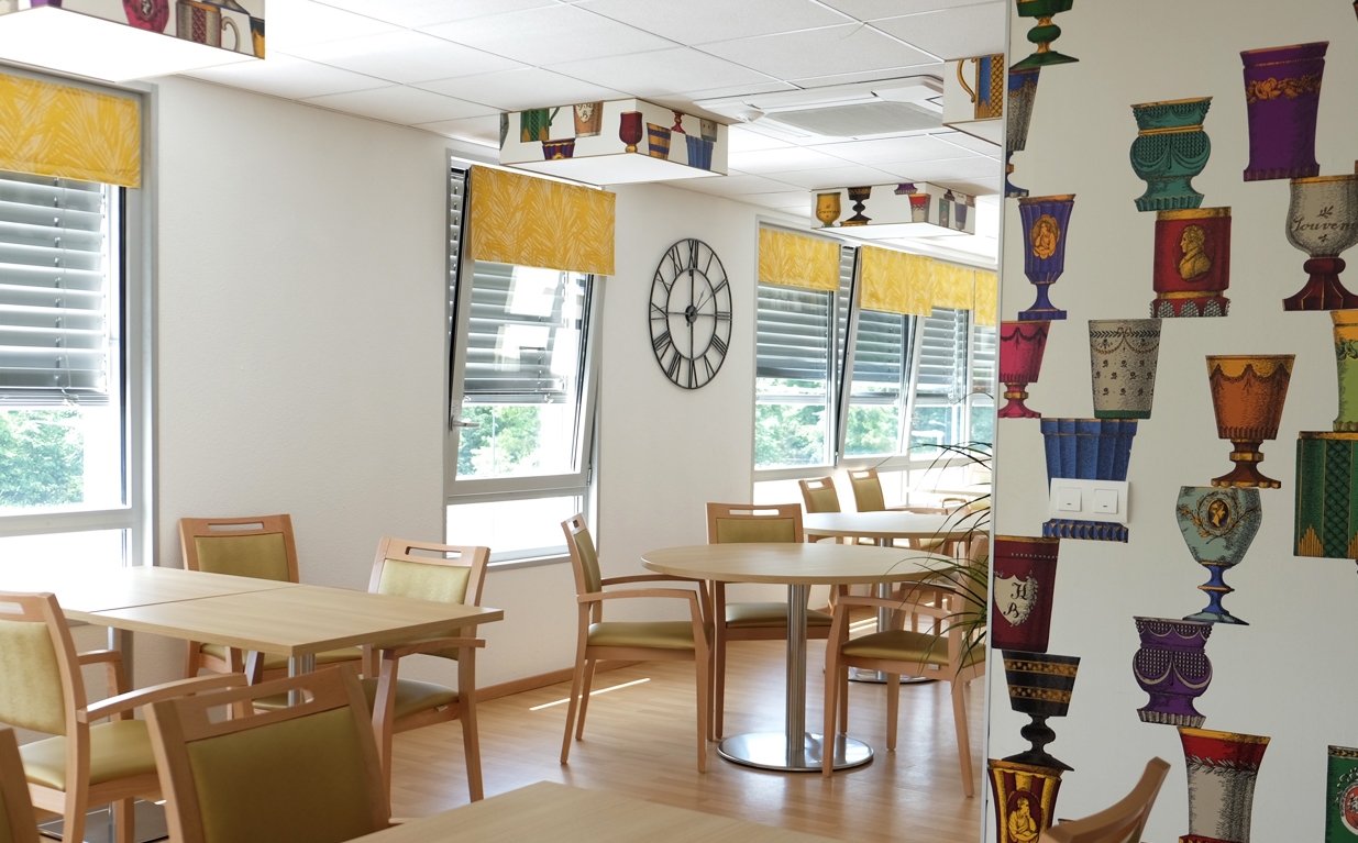 Confection et installation de rideaux, voilages et jetés de lit matelassés dans les chambres et également de rideaux, voilages, stores américains et stores vénitiens dans les parties communes pour cet établissement de 84 lits.